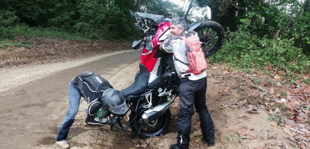 Yeah. First river crossing and I dumped Sahara. 😦 The dash display is not working. Oh well. Lesson learned: wait for the guys to walk beside you while crossing rivers. (I did not know that, and just rode right in following Luis and Jose. Hahaha! :-)) Worst: Eugenie and Alex passed along an edge that was less than knee high, so getting water in the dash could have been avoided. 😦 Oh well. All part of the adventure. As my friend, Robert says, “No risk, no fun!” It was indeed great fun.