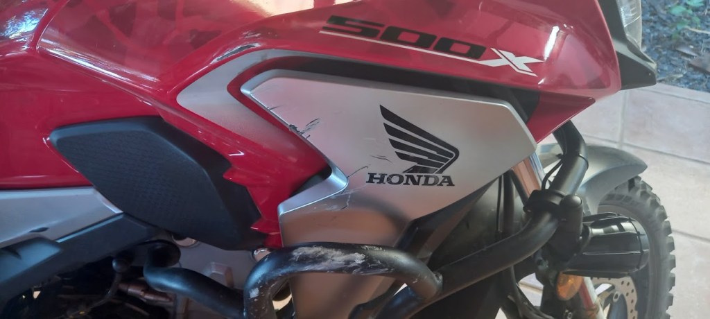 Soon, I did take another spill on a loose-gravel curve (surprise!), where Dave had stopped, and thus I lost my momentum. I know to stay farther behind others while riding on gravel. Dave is such a gentleman that he apologized for stopping. Poor Sahara did get some bad war wounds. Again, all part of the adventure.