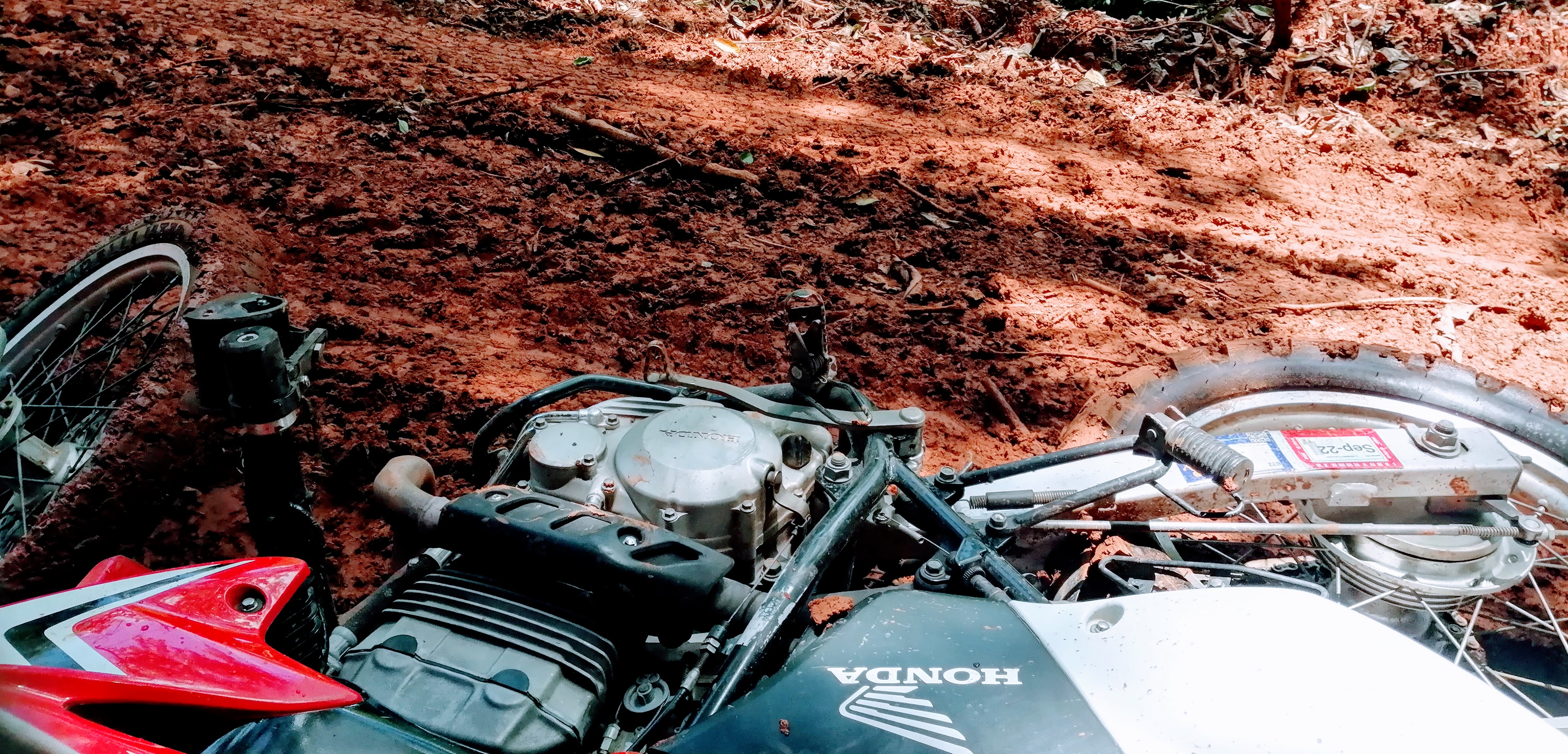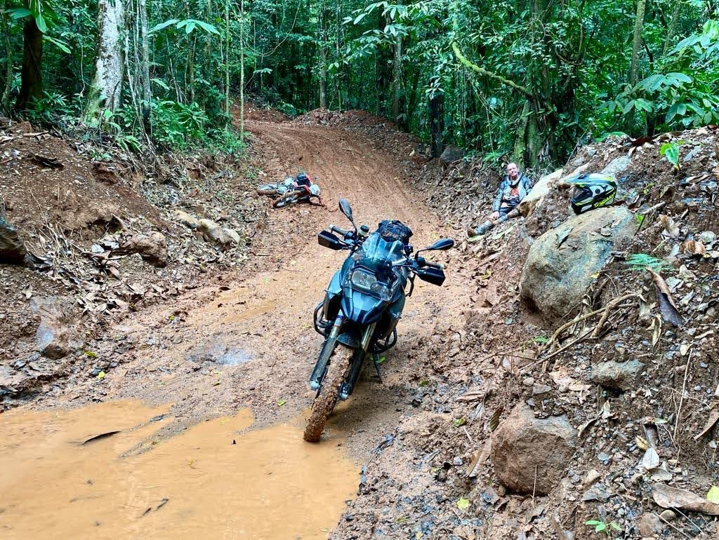The road was still too splippery to ride. Back to paddle-walking the motorcycles down slowly till we hit gravel. This left my arms and thighs sore for two days!