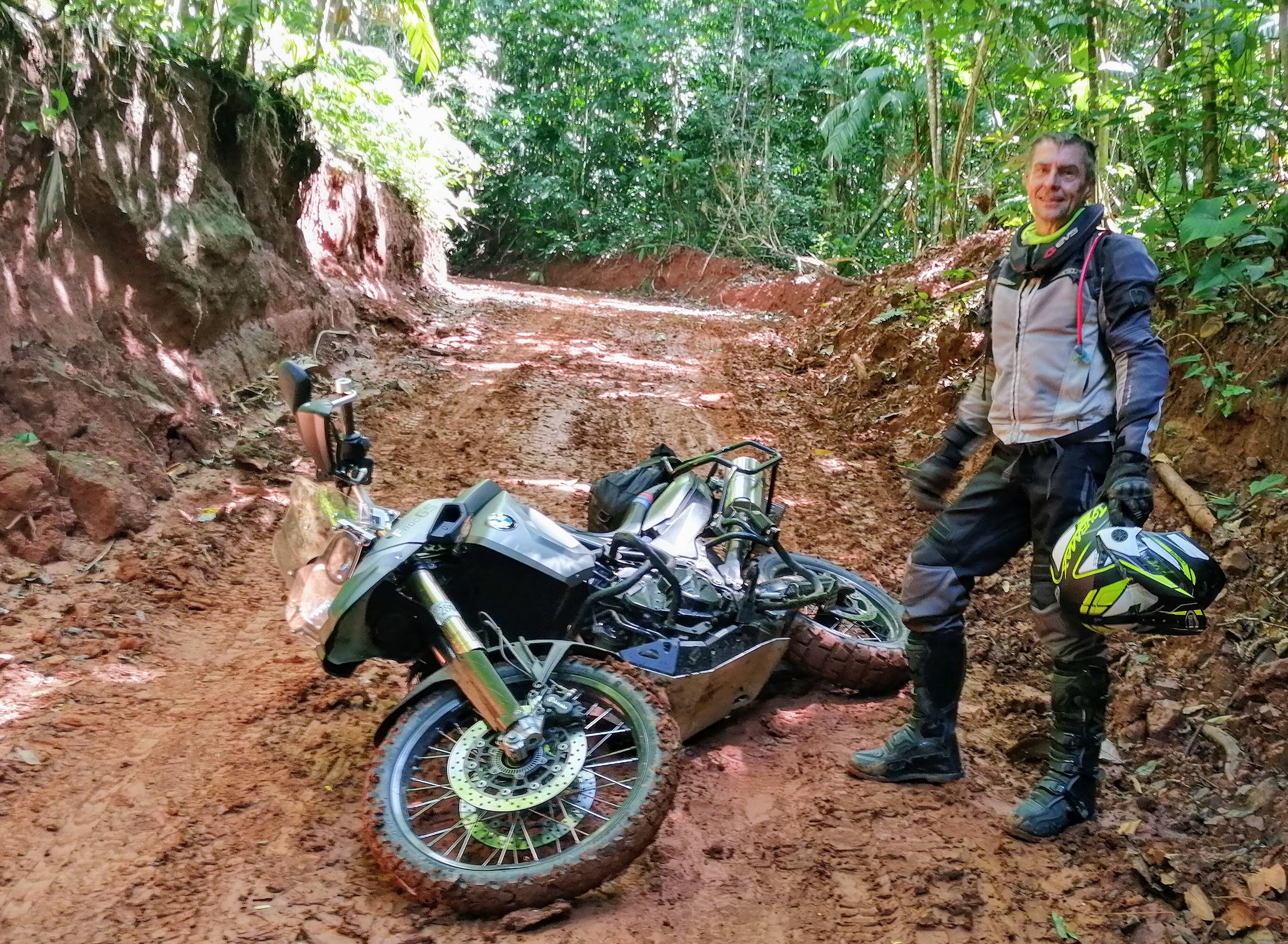 Then, one guy with a slightly bigger motorcycle took first me, then Robert, up to the top. We would not have made it up and out without their help. It was too slippery. Several guys had to push his bike from behind to support it as it went uphill. Too heavy for the slippery trail!