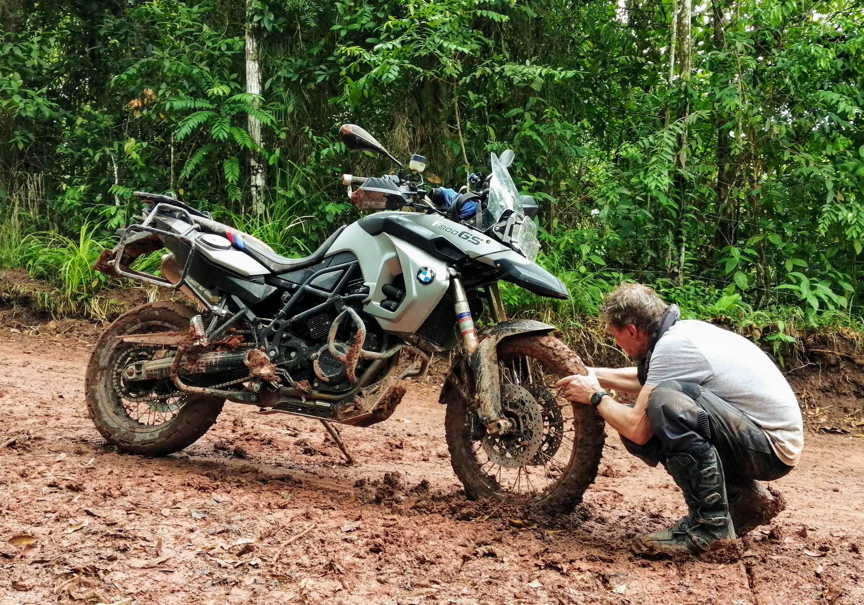 We called our friend Cristian for help and continued resting. After about 45 minutes, Robert mustered up enough energy to clear the mud from under the fender, and the wheel eventually broke free. Phew!