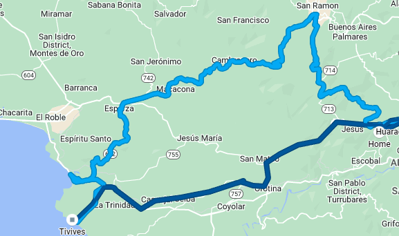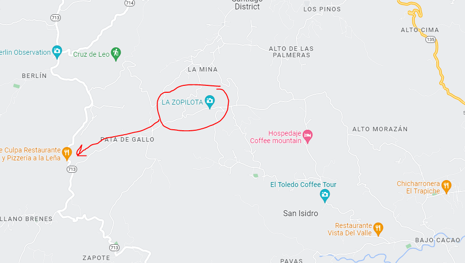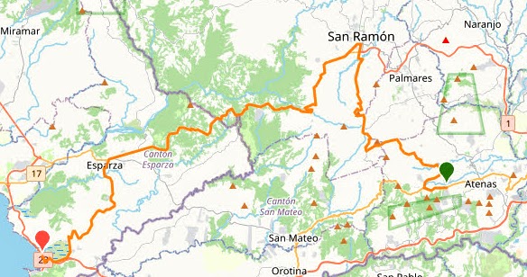 We went through Pata de Gallo to Route 713, through Llano Brenes to San Ramón, then over to Caldera for breakfast.