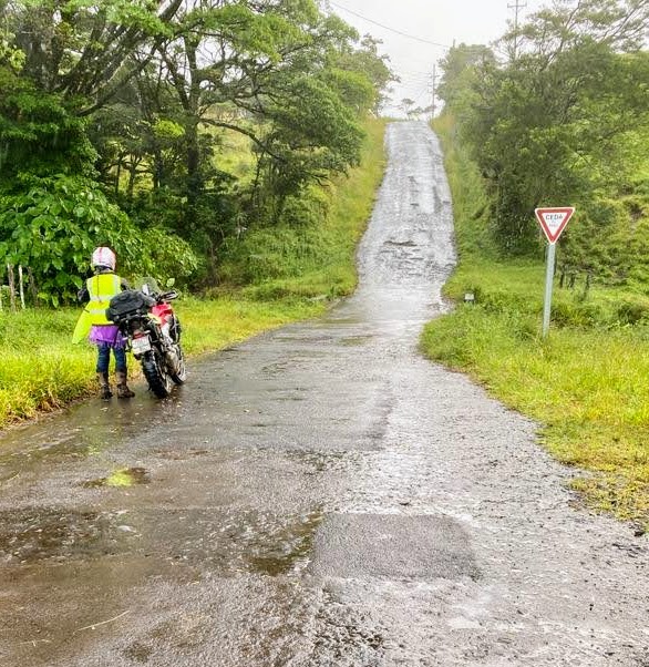 The road is mostly smooth dirt with a tad of gravel, but when it gets steep, as it did more than once, it is full of ruts/ditches with rocks from eight months of hard rains. It was a bit challenging, but also great fun! We made it up to the top without trouble, thank the Zopilota, our ReconCR goddess! Hahaha!