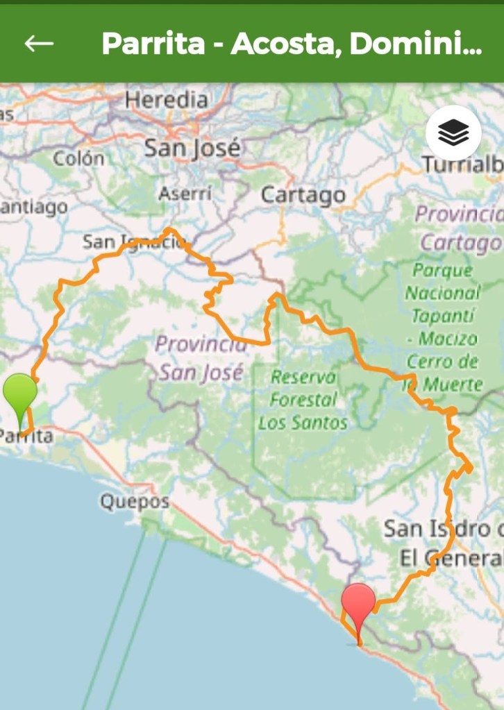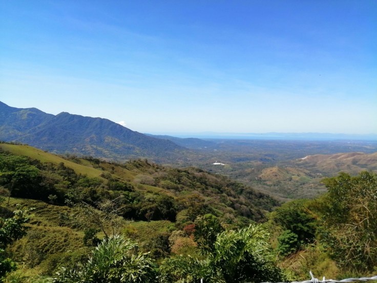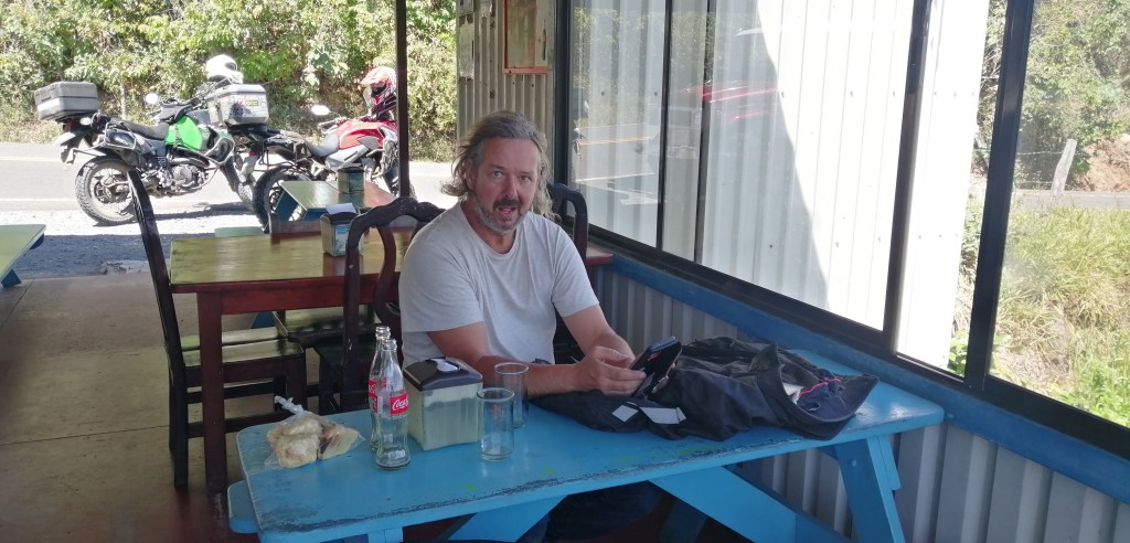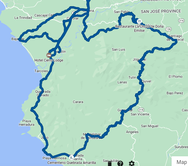 We stopped for a snack at Soda Pura Vida. Lots of laughs given that Craig is a “hilarious British dude.” Then, we enjoyed the rest of route 239 to Puriscal, with its wide and awesome vistas. Reaching Puriscal, we took a left and wound down route 137, heading towards Orotina, which is all asphalt, has delicious curves, and also has fantastic views.