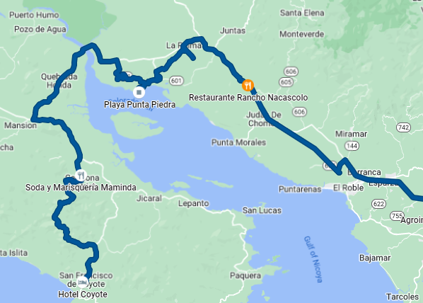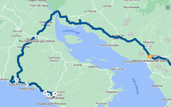Robert had never done the road from Carrillo to Coyote. I took him to Carrillo through Hojancha, which is one of my favorite routes to get to the area. I was glad I did. I really enjoyed all the easy curves. This is partly paved with potholes, partly now-smooth white gravel, and the rest is paved.