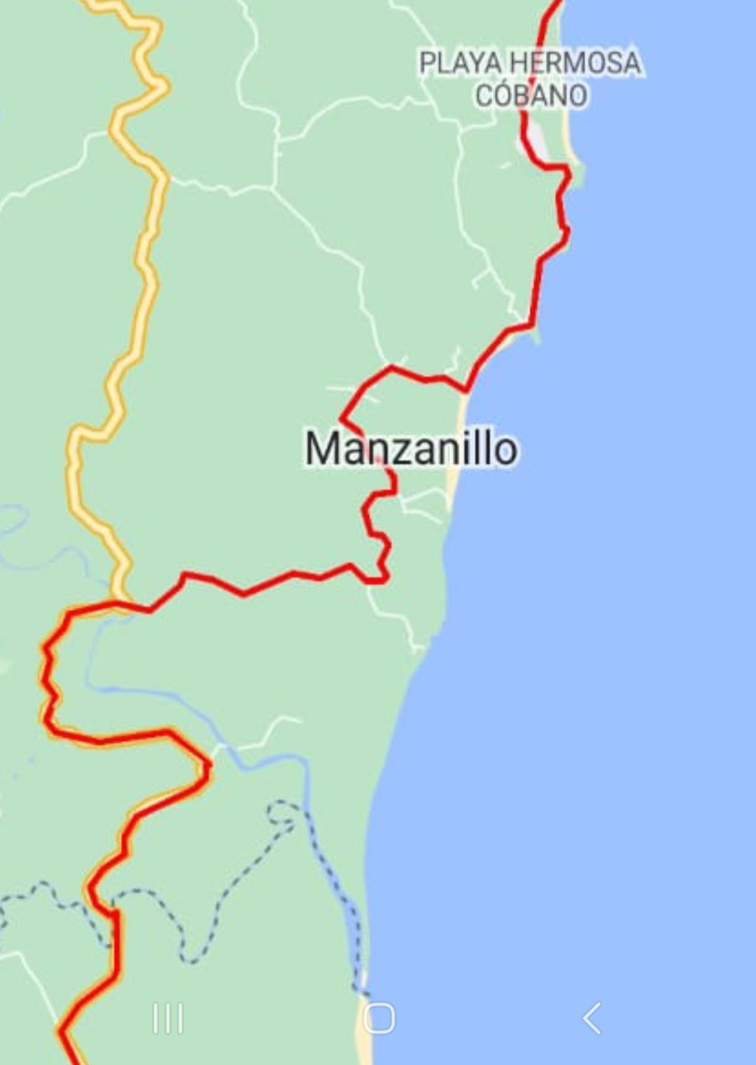 After the next river crossing — where Jorge said we needed to go left, not straight up to a wooden gate where he had once had to back up, back into the river — we met a local man who said he could guide us to Manzanillo town, thus avoiding the beach which was at high tide. YAY!! What luck!