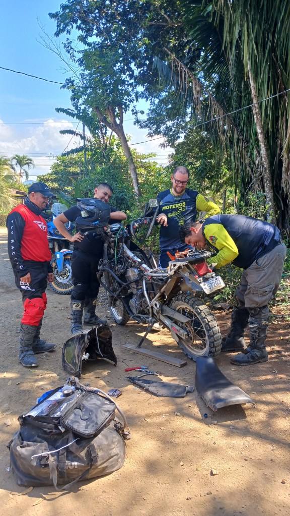 From Cabuya to Santa Tereza, the route was slippery in parts. At one point when I had to stop suddenly because two others were stopped, I dropped the motocylce. This happens all the time to many motorcyclists. It’s just part of riding. Dropping it when stopped or stopping. Hahaha!